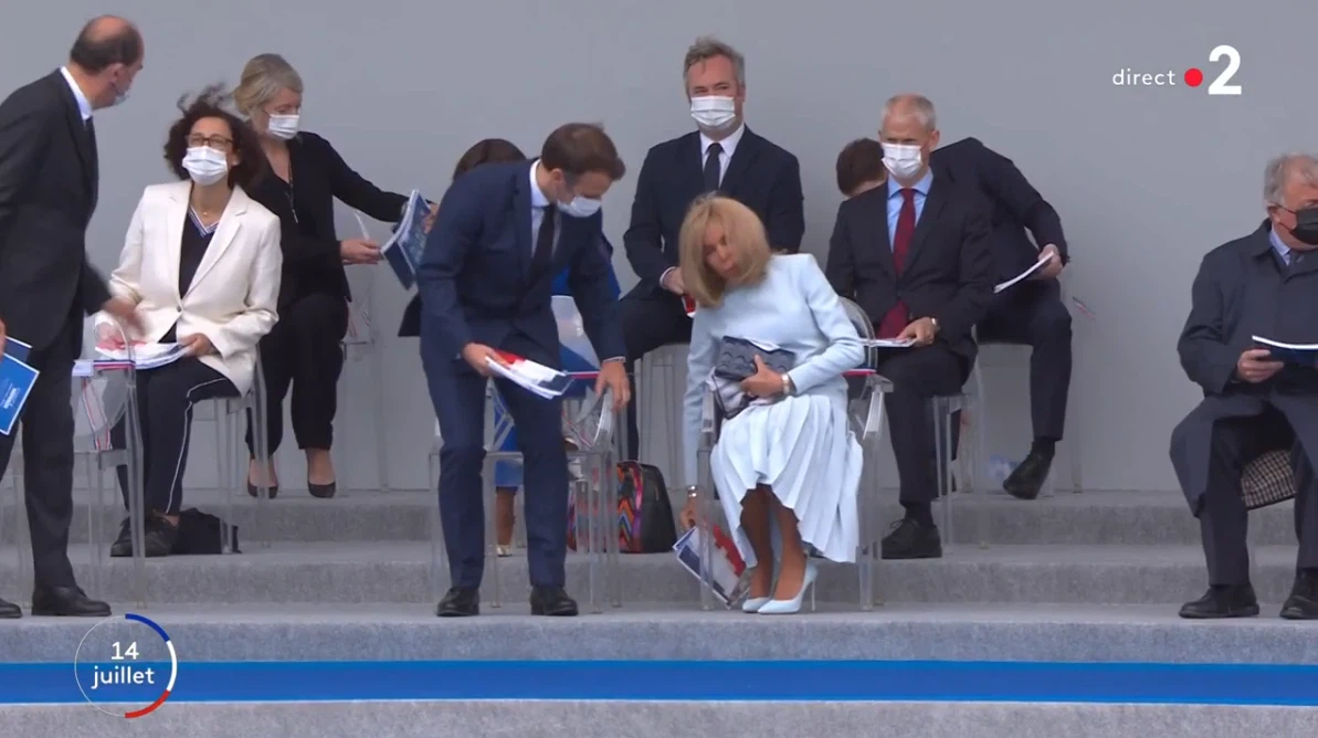 Theo đó, trong một đoạn video ngắn được chia sẻ trên mạng xã hội có thể thấy khi các khách mời ngồi xuống ghế để theo dõi lễ diễu binh thì trên ghế có đặt những cuốn sách báo, dường như chứa đựng nội dung kỷ niệm của buổi lễ. Trong khi Tổng thống Pháp cùng các vị khách lịch sự cầm nó trên tay rồi đặt nó lên người sau khi ngồi xuống thì Đệ nhất phu nhân lại có hành động khác biệt.