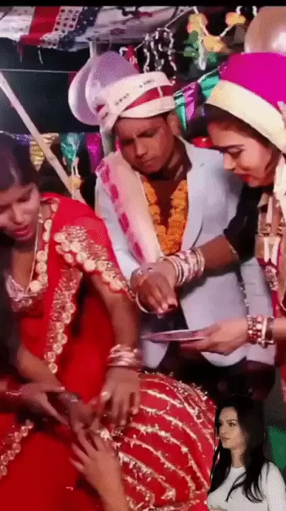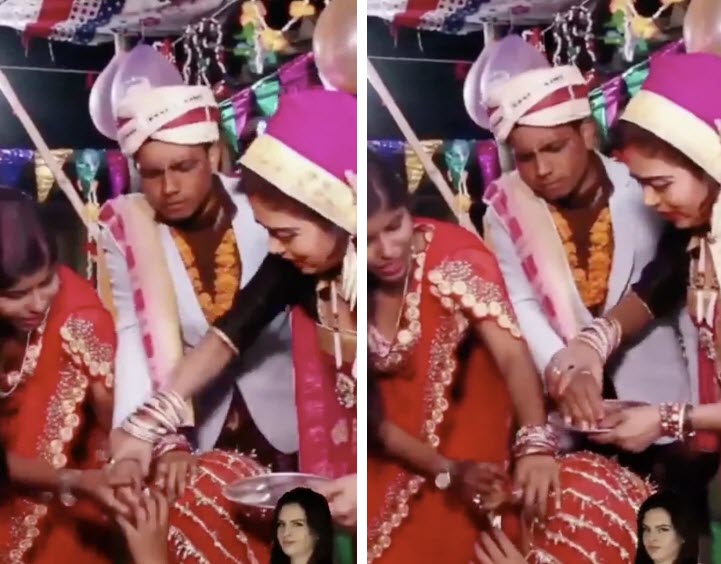 Trong đoạn clip đang được dân mạng truyền tay nhau, cô dâu đang ngồi, bên cạnh là 2 người phụ nữ và chú rể của mình. Họ chuẩn bị bước vào nghi lễ chấm son đỏ lên trán cô dâu, tuyên bố nàng là người đã có gia đình. Hai người phụ nữ cầm tay chú rể nhúng vào đĩa son đã chuẩn bị sẵn rồi chấm lên trán cô dâu.