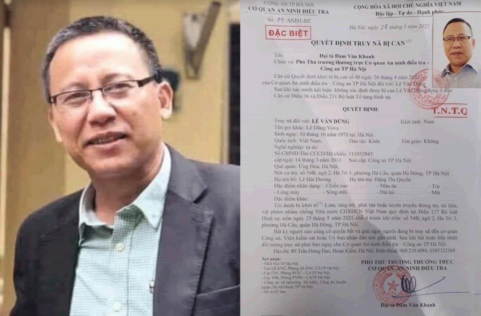 Nhà báo Lê Văn Dũng (51 tuổi), hay còn được biết đến với cái tên Lê Dũng Vova, bị Cơ quan an ninh điều tra Công an Hà Nội bắt giữ hôm 30/6 sau khoảng một tháng bị truy nã. Ông bị khởi tố về tội làm, tàng trữ, phát tán hoặc tuyên truyền thông tin, tài liệu, vật phẩm chống Nhà nước theo Điều 117 Bộ Luật Hình sự.