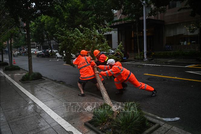 Công nhân môi trường di chuyển cây đổ do ảnh hưởng của bão In-Fa tại Ninh Ba, Chiết Giang (Trung Quốc) ngày 25/7/2021. Ảnh: AFP/TTXVN