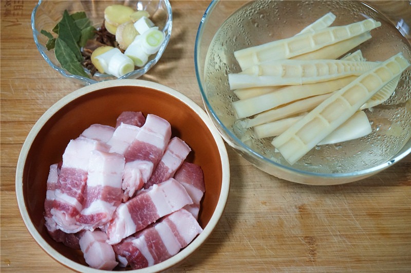 Thái măng và bỏ vào tô nước lạnh, rửa sạch thịt lợn và cắt thành từng miếng nhỏ. Chuẩn bị gia vị để vào tô.