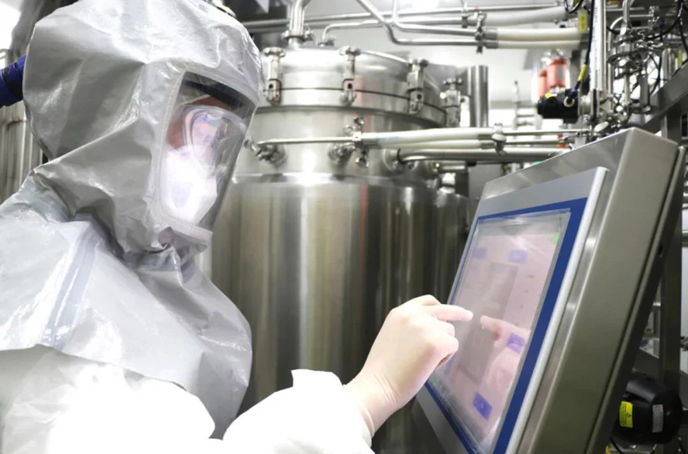 Một công nhân SinoPharm trong trang phục bảo hộ vận hành ống nuôi virus tại nhà máy mới. Ảnh: Handout