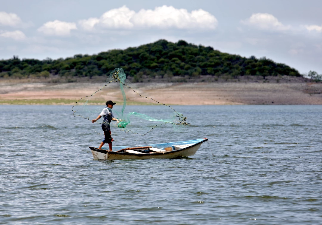 Một ngư dân quăng lưới ở hồ chứa Agua Caliente ở Cajeme, Sonora. Hạn hán đã làm mực nước giảm xuống dưới mức bình thường. Ảnh: Los Angeles Times.