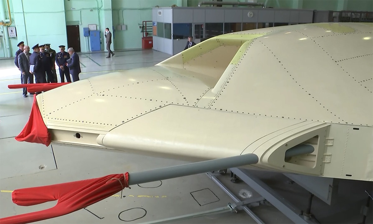 Phần thân đang lắp ráp của UAV S-70 Okhotnik xuất hiện trong video Bộ trưởng Quốc phòng Nga thăm nhà máy hàng không Novosibirsk.