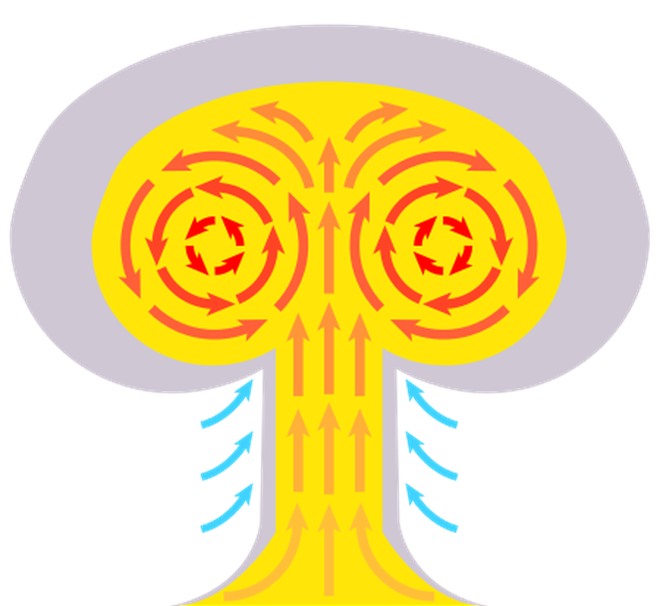 H́nh ảnh này cho thấy hướng của ḍng chất lỏng sau khi một quả bom hạt nhân phát nổ, với mũi tên màu xanh là ḍng không khí lạnh góp phần định h́nh nên h́nh nấm đặc trưng.