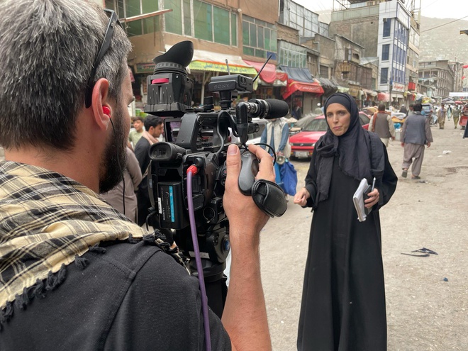 Nữ phóng viên Clarissa Ward tác nghiệp tại Kabul. Ảnh: AP.