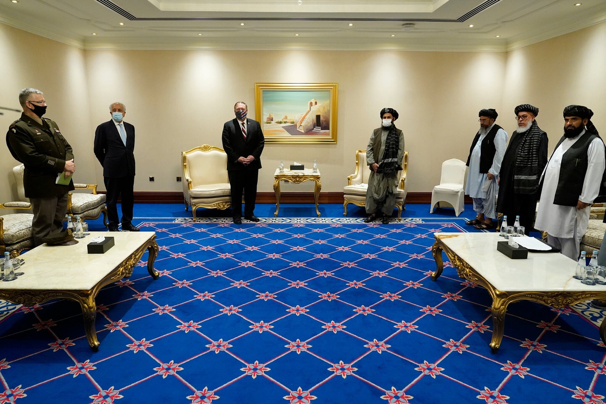 Ngoại trưởng Mỹ Mike Pompeo trong cuộc đàm phán với chỉ huy Taliban Mullah Abdul Ghani Baradar tại Doha. Ảnh: New York Times.