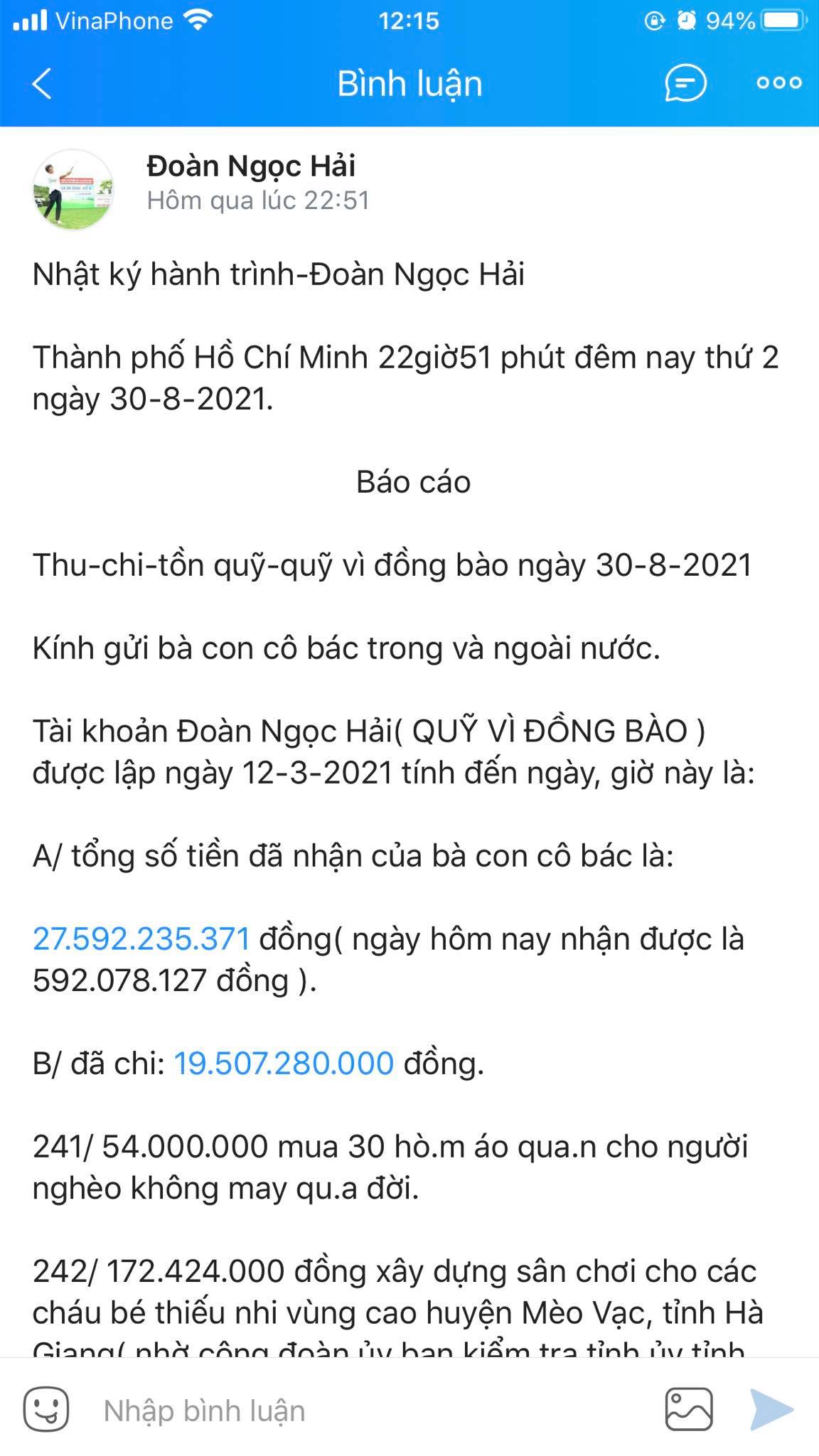 Về phía ông Đoàn Ngọc Hải, vì Facebook bị cấm chức năng đăng tải bài viết nên ông đã chuyển sang hoạt động ở Zalo. Giữa lúc bị réo tên” khắp diễn đàn, ông vẫn đều đặn báo cáo quá trình từ thiện trong ngày 30/08. Kèm với bản cam kết mục đích sử dụng tiền thiện nguyện từ tài khoản ngân hàng Đoàn Ngọc Hải. Động thái này đã thay cho những thắc mắc về vấn đề thu chi của ông Hải trong thờ gian qua.