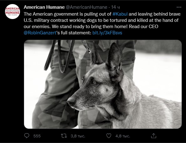 Tổ chức phi lợi nhuận American Humane đã lên án "bản án tử hình có hiệu lực" mà quân đội Mỹ đã tuyên cho những con chó phục vụ theo hợp đồng khi để chúng có nguy cơ bị rơi vào tay lực lượng dân quân Hồi giáo Taliban.