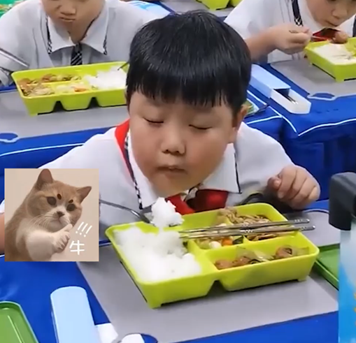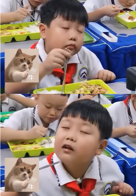 Hầu hết đều cho rằng bữa ăn tại nhà trường quá ngon nên cậu bé có vẻ mặt thỏa măn đến thế, số ít khẳng định nam sinh đang ngủ gật nên em nhắm tịt mắt trong suốt bữa cơm.