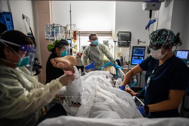 Nhân viên y tế điều trị cho bệnh nhân COVID-19 tại một bệnh viện ở Tarzana, bang California, Mỹ ngày 2/9/2021. Ảnh: AFP/TTXVN