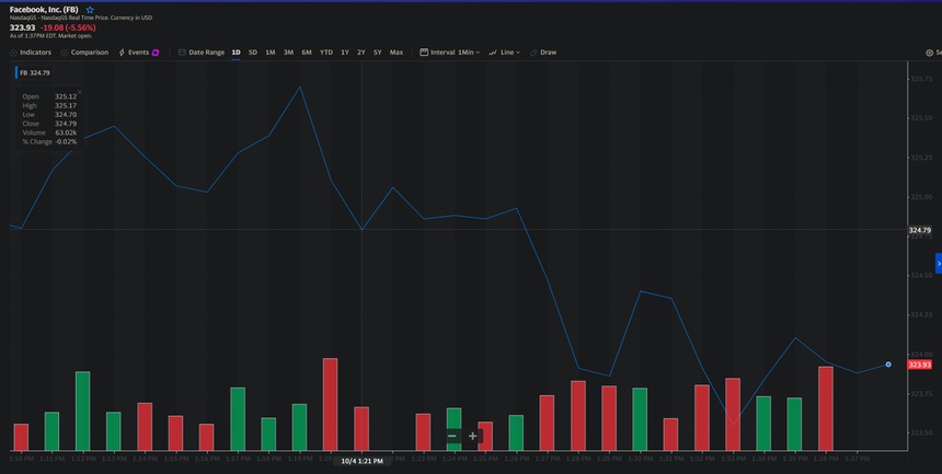 Tính đến 13h ngày 4/10 (giờ Mỹ), tức 0h 5/10 (giờ Việt Nam), cổ phiếu của Facebook trên sàn Nasdaq giảm 5,3% giá trị so với đầu ngày, về mốc 324,87 USD/cổ phiếu. Giá trị vốn hóa của công ty đang về mức 916,2 tỷ USD. Trên các sàn S&P 500 và Nasdaq Composite Index, giá cổ phiếu của Facebook cũng giảm từ 1,7-2,61%.