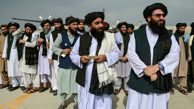 Người phát ngôn Taliban Zabihullah Mujahid cùng một nhóm quan chức Taliban tại sân bay Kabul sau khi Mỹ rút quân. Ảnh: AFP.