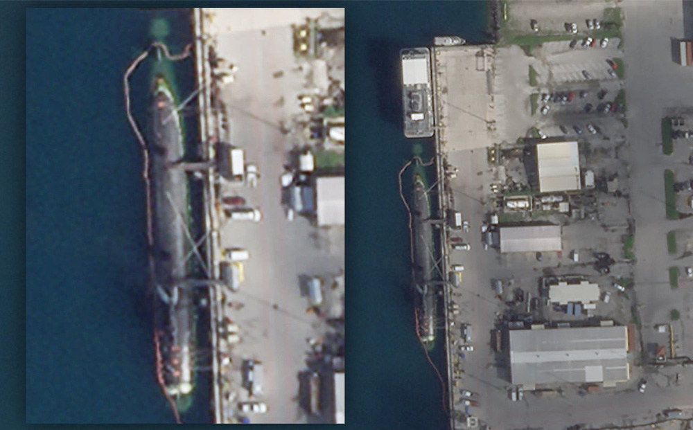 Theo The Drive, hình ảnh vệ tinh này có độ phân giải cao, được chụp ngày 20/10. Ảnh cho thấy có hai tàu ngầm ở cảng tại đảo Guam. Một tàu được buộc vào bến cảng phía tây gần tàu liên lạc USS Emory S. Land.