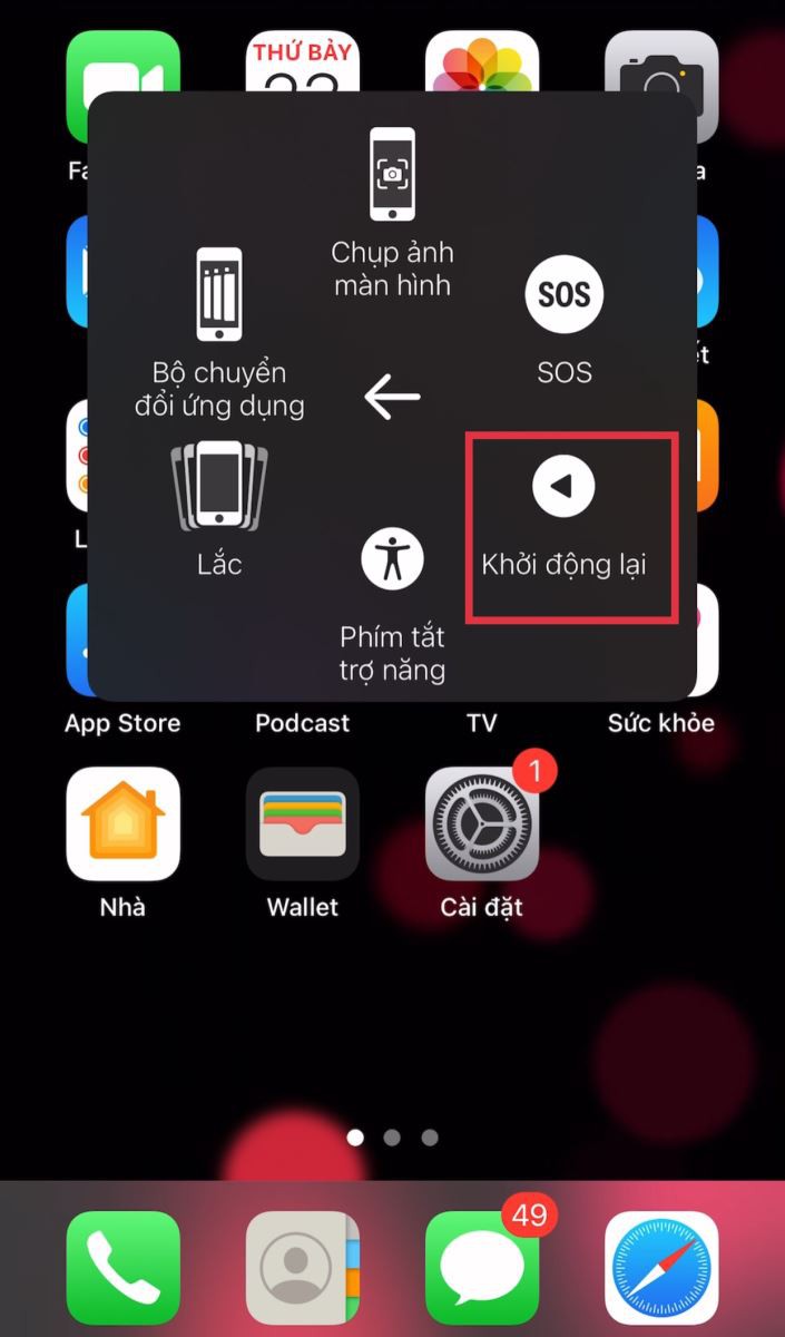Đây là một trong những cách thông dụng mà hầu như là phản xạ mỗi khi điện thoại bị lỗi, khởi động lại có thể giúp khắc phục những lỗi vặt trên điện thoại iPhone một cách hiệu quả và đơn giản. Bạn khởi động lại điện thoại bằng cách Ấn nút Home ảo và chọn Khởi động lại hoặc nhấn giữ nút nguồn.
