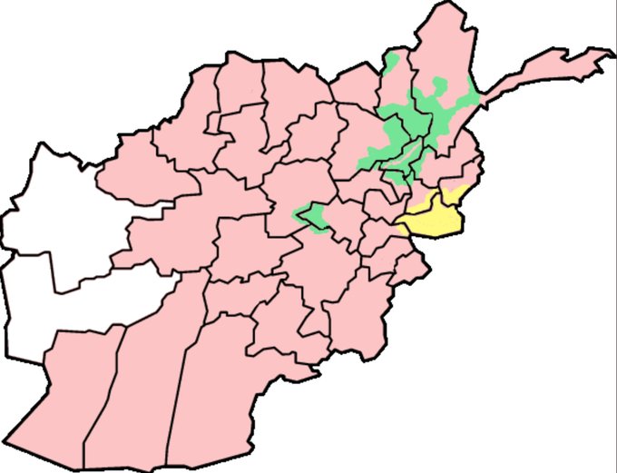 Một bản đồ miêu tả các khu vực của Afghanistan do Taliban (đỏ), NRF (xanh), IS-K (vàng) kiểm soát vào đầu tháng 10. Màu trắng là các tỉnh Herat và Farah nơi được cho là đang diễn ra giao tranh trong nội bộ Taliban.