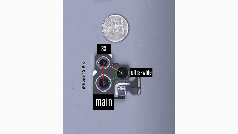iPhone 13 Pro được trang bị cảm biến camera lớn hơn, nhưng đó không phải là lý do Apple thiết kế cụm camera sau theo hình tam giác. Apple đã sử dụng thiết kế này kể từ iPhone 11 Pro ra mắt năm 2019. Khi đó, Apple hoàn toàn có thể đặt các cảm biến theo chiều dọc giống như Huawei P30 Pro, hay theo chiều ngang như Samsung Galaxy S10.