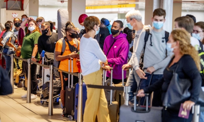 Hành khách xếp hàng tại sân bay Schiphol, Amsterdam, Hà Lan, hôm 12/7. Ảnh: Reuters.