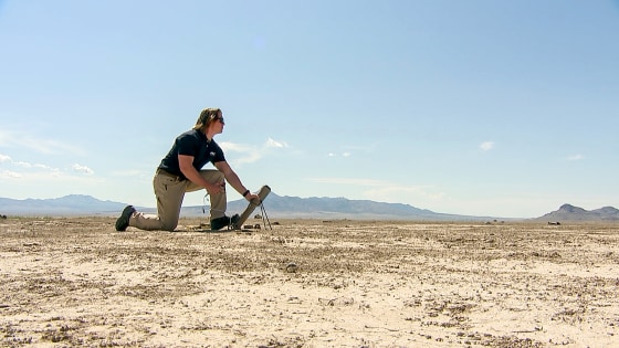 Nhà điều hành của công ty AeroVironment chuẩn bị phóng máy bay không người lái tự sát Switchblade tại sa mạc Utah. Ảnh NBC News.