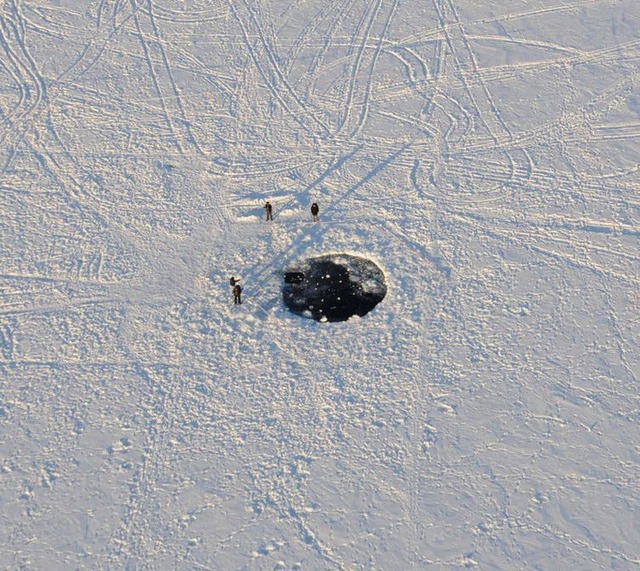 Nơi mảnh vỡ chính của thiên thạch rơi xuống đã tạo thành 1 cái hố rộng 8 m trên mặt băng của hồ Chebarkul. Ảnh: Eduard Kalinin