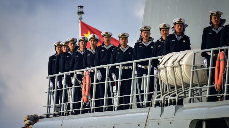 Các quân nhân Trung Quốc trong lễ tiễn các tàu chiến của Nga và Trung Quốc chuẩn bị tham gia giai đoạn 2 của "Hợp tác Hải quân 2017" - một cuộc tập trận chung giữa Nga và Trung Quốc ở Biển Nhật Bản và Biển Okhotsk. Ảnh TASS