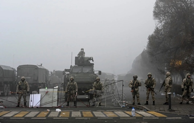 Binh sĩ đứng gác trên đường phố Almaty, thành phố lớn nhất Kazakhstan, ngày 6/1. Ảnh: Reuters.