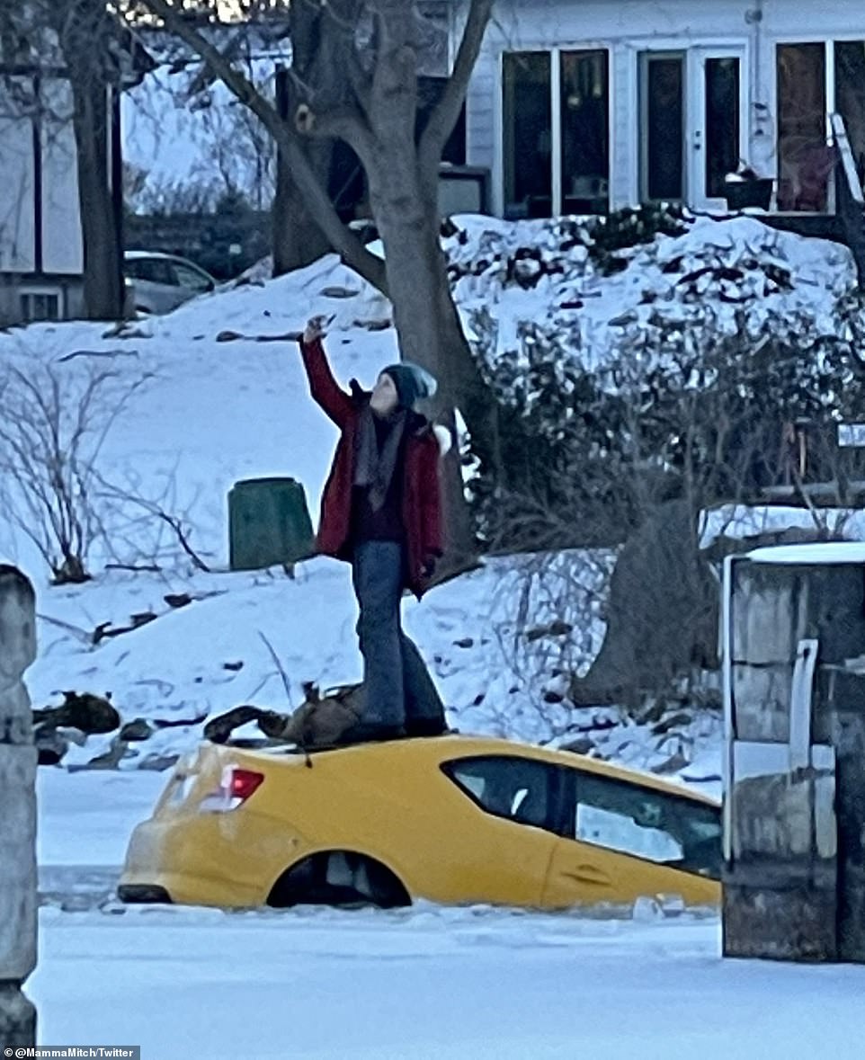 Những hình ảnh gây sốc do người dân địa phương chụp lại, cho thấy người phụ nữ đứng trên nóc xe hơi, bình thản chụp ảnh selfie, không có vẻ gì là lo sợ.