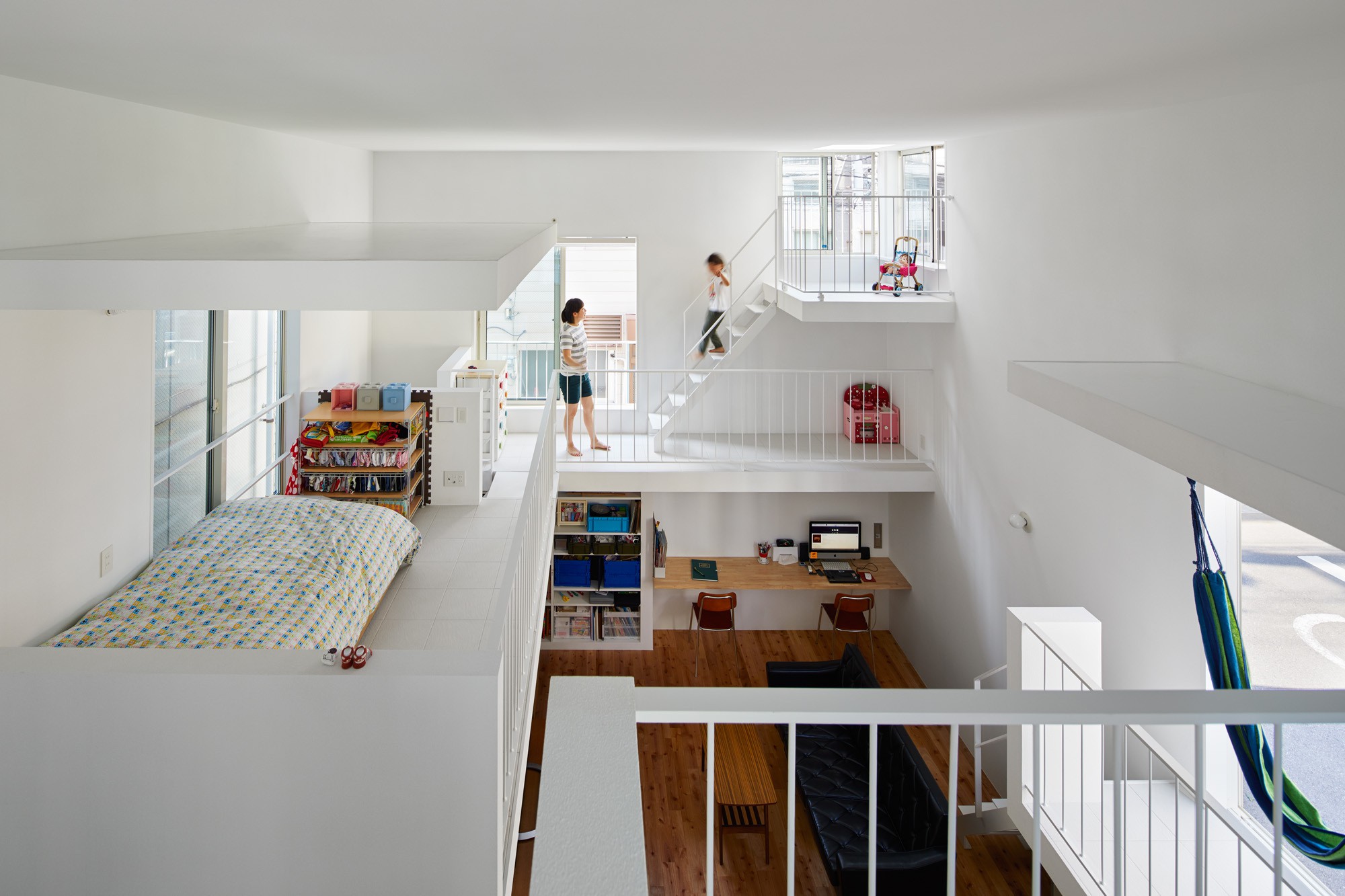 Việc đưa toàn bộ không gian phòng ngủ lên những khoảng ban công được bố trí quanh nhà thế này giúp các thành viên rất dễ kết nối với nhau cũng như tạo nên sự kết nối mật thiết giữa tầng 1 và tầng 2. Có thể nhiều người sẽ cho rằng việc đưa phòng ngủ ra ban công khá kém sự riêng tư nhưng sự chênh lệch về cao độ cũng như sắp xếp không gian khéo léo cũng đủ tạo ra sự phân khu cần thiết. Nếu cần thiết, gia đình này chỉ cần bổ sung thêm rèm che ở ban công là được.