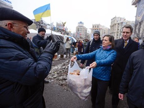 Bà Nuland phát bánh mì trong chuỗi sự kiện Euromaidan ở Kiev, Ukraine vào năm 2014.