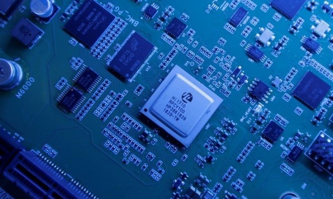 Một con chip do Hisilicon, công ty con của Huawei, thiết kế, được trưng bày tại trụ sở công ty ở Thâm Quyến, Quảng Đông, Trung Quốc, hồi năm 2019. Ảnh: Reuters.