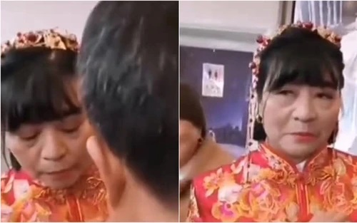 Dù đã được trang điểm kỹ càng nhưng lớp son phấn vẫn không thể che đậy nổi tuổi tác của cô dâu lớn tuổi.