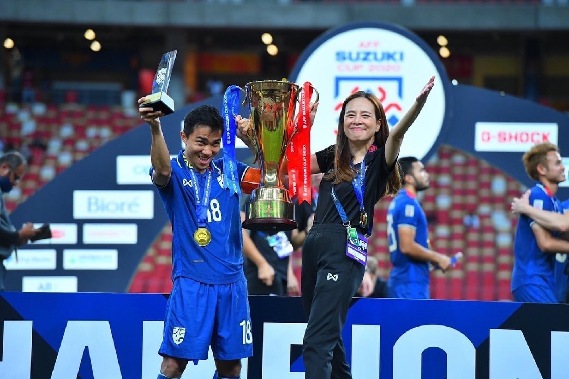 Madam Pang nâng cúp cùng "Messi Thái" Chanathip, ăn mừng chức vô địch AFF Cup 2020. Ảnh: Instagram PangLamsam