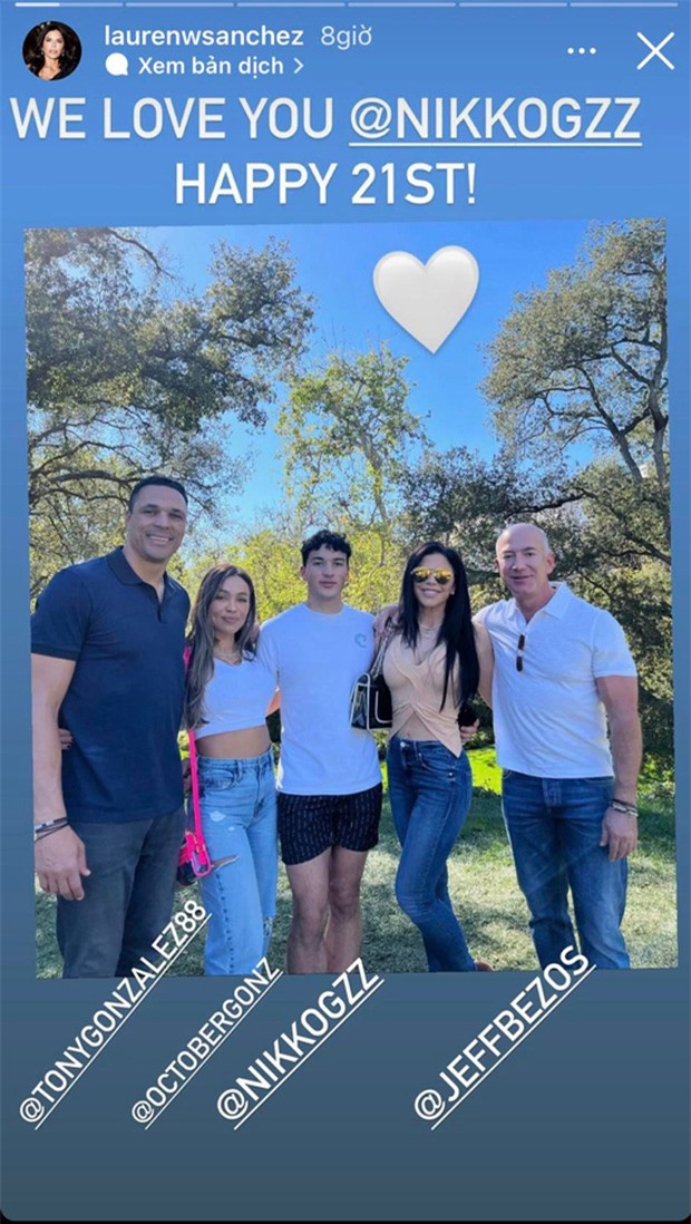 Cùng ngày, bức ảnh chụp cùng Bezos, vợ chồng Tony Gonzales và con trai Nikko cũng được bà đăng tải lên mạng xã hội Instagram để chúc mừng sinh nhật lần thứ 21 của con. Trong ảnh, bà khoác tay sau lưng Jeff Bezos, nhẹ nghiêng về phía bạn trai một cách tình tứ.