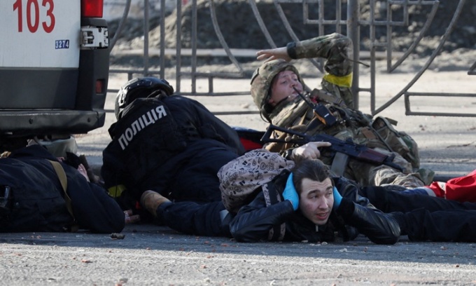 Tại trung tâm Kiev, phóng viên Reuters nhìn thấy nhiều binh sĩ Ukraine mang theo súng và một nhóm phụ nữ vội vã chạy trên đường. Gần đó, các binh sĩ bắt một người đàn ông mặc quần áo dân sự nằm xuống vỉa hè.