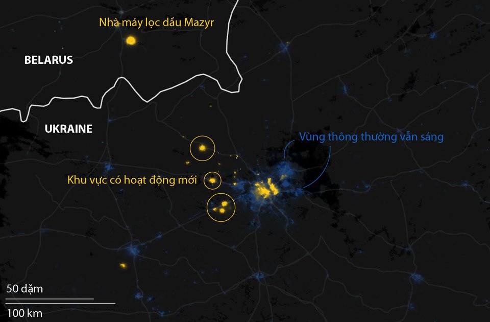 Quá trình so sánh ánh sáng ban đêm cũng có thể tiết lộ địa điểm có các hoạt động bất thường trên mặt đất. Ảnh vệ tinh ngày 28/2 cho thấy các nguồn sáng mới nằm về phía tây và bắc của Kyiv. Đây có thể là ánh sáng từ đoàn xe quân sự dài hàng chục km của Nga đang áp sát thủ đô Kyiv.
