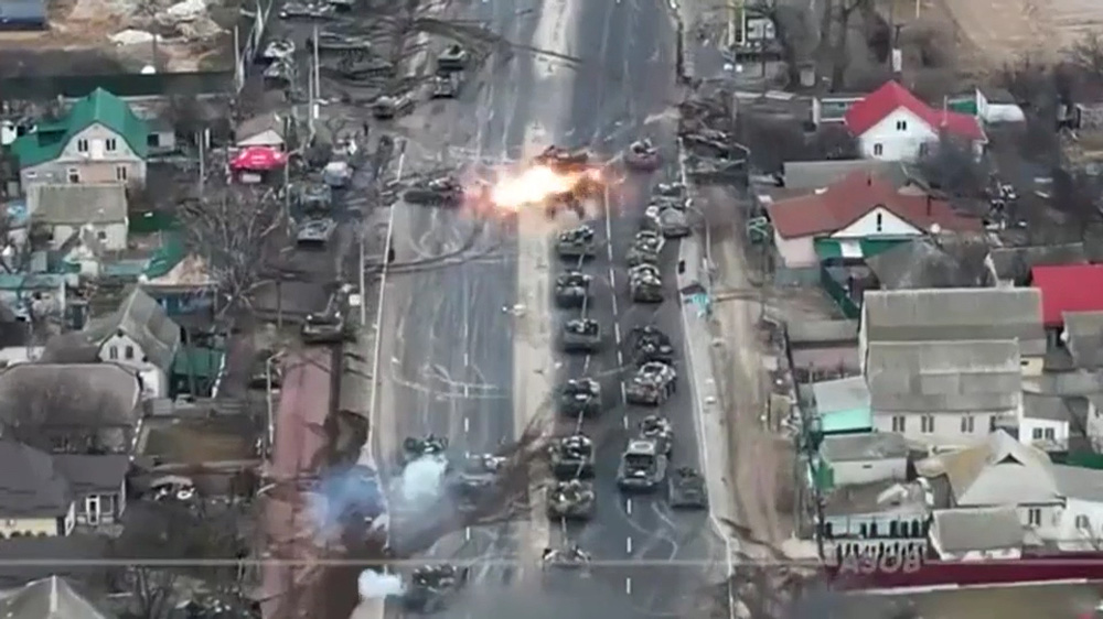 Ảnh đoàn xe cơ giới Nga bị tập kích hỏa lực gần Kiev, cắt từ video do Bộ Quốc phòng Ukraine công bố
