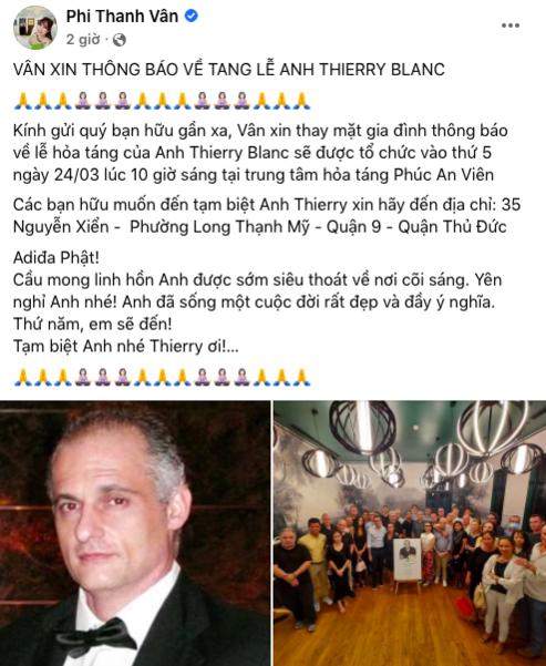 "Kính gửi quư bạn hữu gần xa, Vân xin thay mặt gia đ́nh thông báo về lễ hỏa táng của Anh Thierry Blanc sẽ được tổ chức vào thứ 5 ngày 24/03 lúc 10 giờ sáng tại trung tâm hỏa táng Phúc An Viên, TP.HCM.