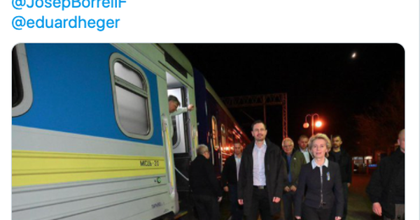Chủ tịch Ursula von der Leyen. Cùng với đại diện cấp cao phụ trách An ninh và Đối ngoại của Liên minh châu Âu (EU) Josep Borrell. Đang trên đường tới thủ đô Kiev của Ukraine.