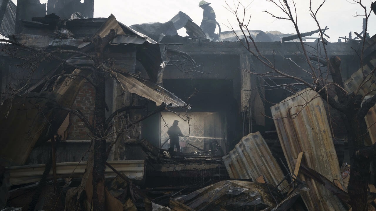 Lính cứu hỏa dập đám cháy trong một khu nhà sau đợt oanh kích của quân đội Nga, Kharkiv, Ukraina, ngày 11/04/2022. AP - Felipe Dana