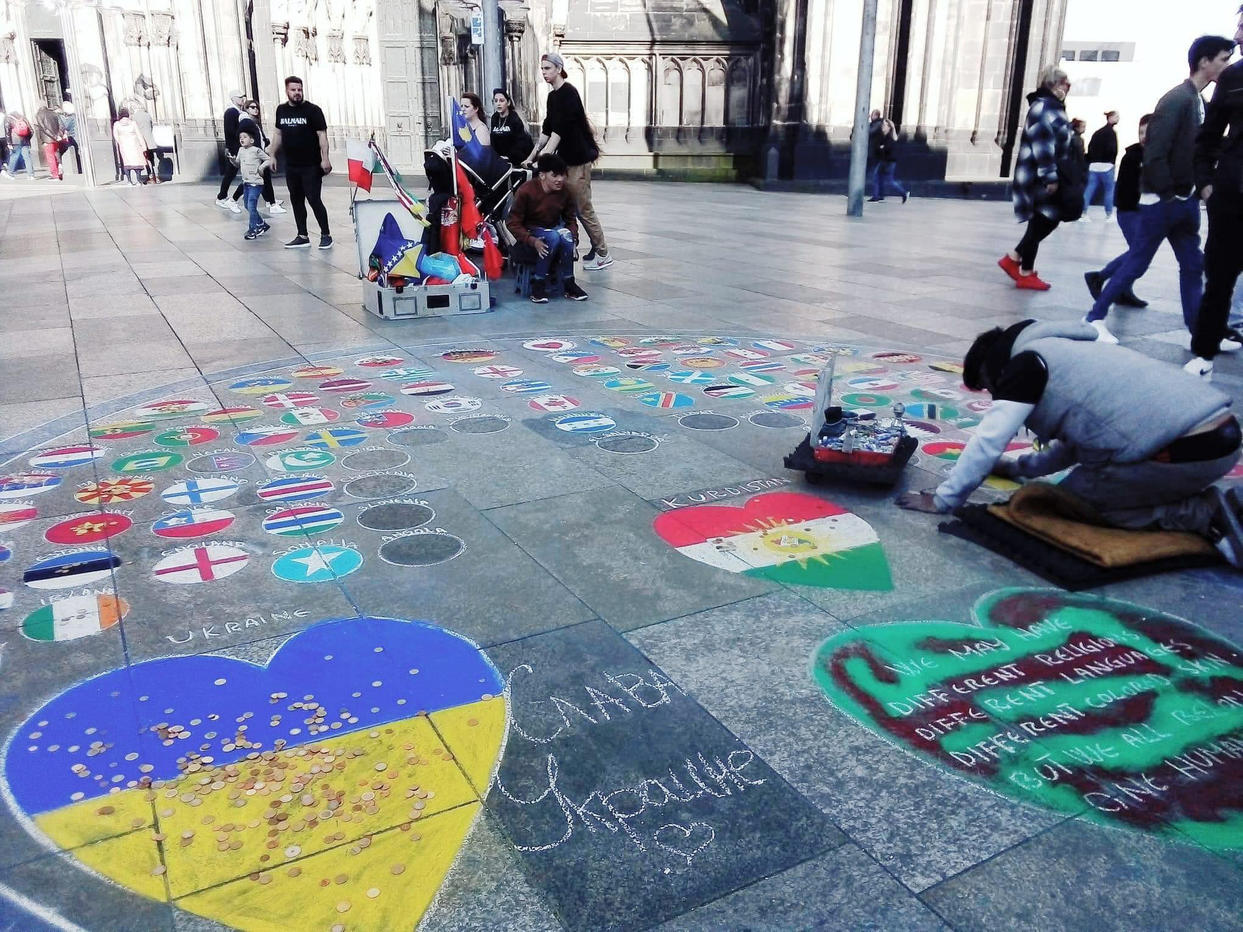 Cổng chính của nhà thờ tấp nập du khách với đủ sắc tộc từ khắp nơi trên thế giới. Một họa sĩ đang gò lưng trên nền đá vẽ trong một vòng tròn rộng lớn tượng trưng cho ngôi nhà Trái Đất, bên trong vòng tròn ấy là quốc kỳ của các nước. Điều gây xúc động mạnh mẽ là quốc kỳ Ukraine là một trái tim 2 màu màu xanh và vàng với dòng chữ bên cạnh "Vinh quang Ukraine" (Слава Украине) với rất nhiều đồng tiền quyên góp cho Ukraine.