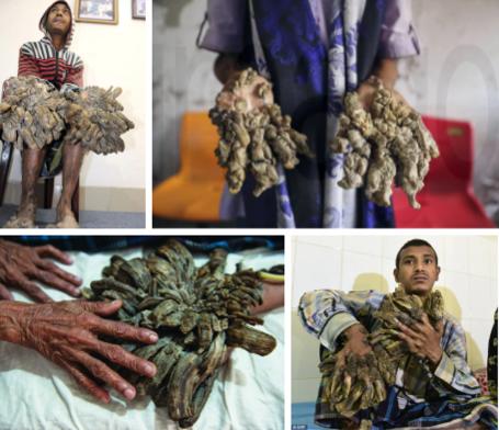 Abul được chẩn đoán mắc một tình trạng da vô cùng hiếm gặp mang tên bệnh biểu bì verruciformis. Bệnh gây ra những tổn thương, biến đổi trên da và cụ thể đã khiến bàn tay anh mọc rất nhiều da thừa kỳ dị trông như nhánh cây. Chỉ trong một thời gian ngắn sau khi mắc bệnh, hai bàn tay của người đàn ông này đã "mọc cây" trông vô cùng kỳ dị và đáng sợ. Không chỉ có tay mà ở chân Abul cũng có tình trạng tương tự.