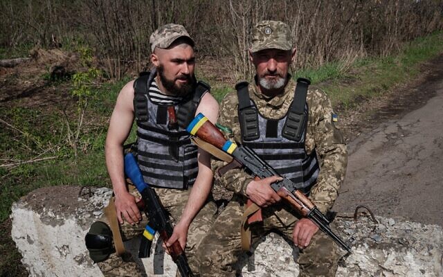 Người lính Ukraine Vasyl, 51 tuổi (phải)và con trai Denys, 22 tuổi (trái) cùng trấn giữ tại một trạm kiểm soát gần Barvinkove, miền đông Ukraine ngày 25 tháng 4 năm 2022. Ảnh (Yasuyoshi Chiba/AFP/Times of Israel)