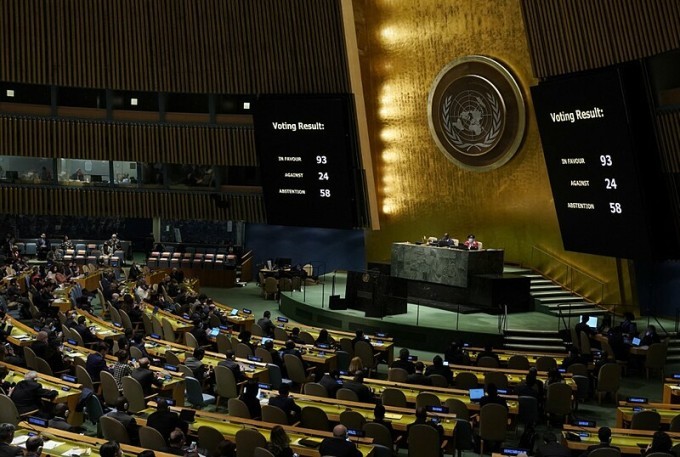 Màn hình hiển thị kết quả bỏ phiếu tại cuộc họp của Đại hội đồng Liên Hợp Quốc ở New York, Mỹ, về việc đình chỉ Nga tham gia UNHRC hôm 7/4. Ảnh: AFP.