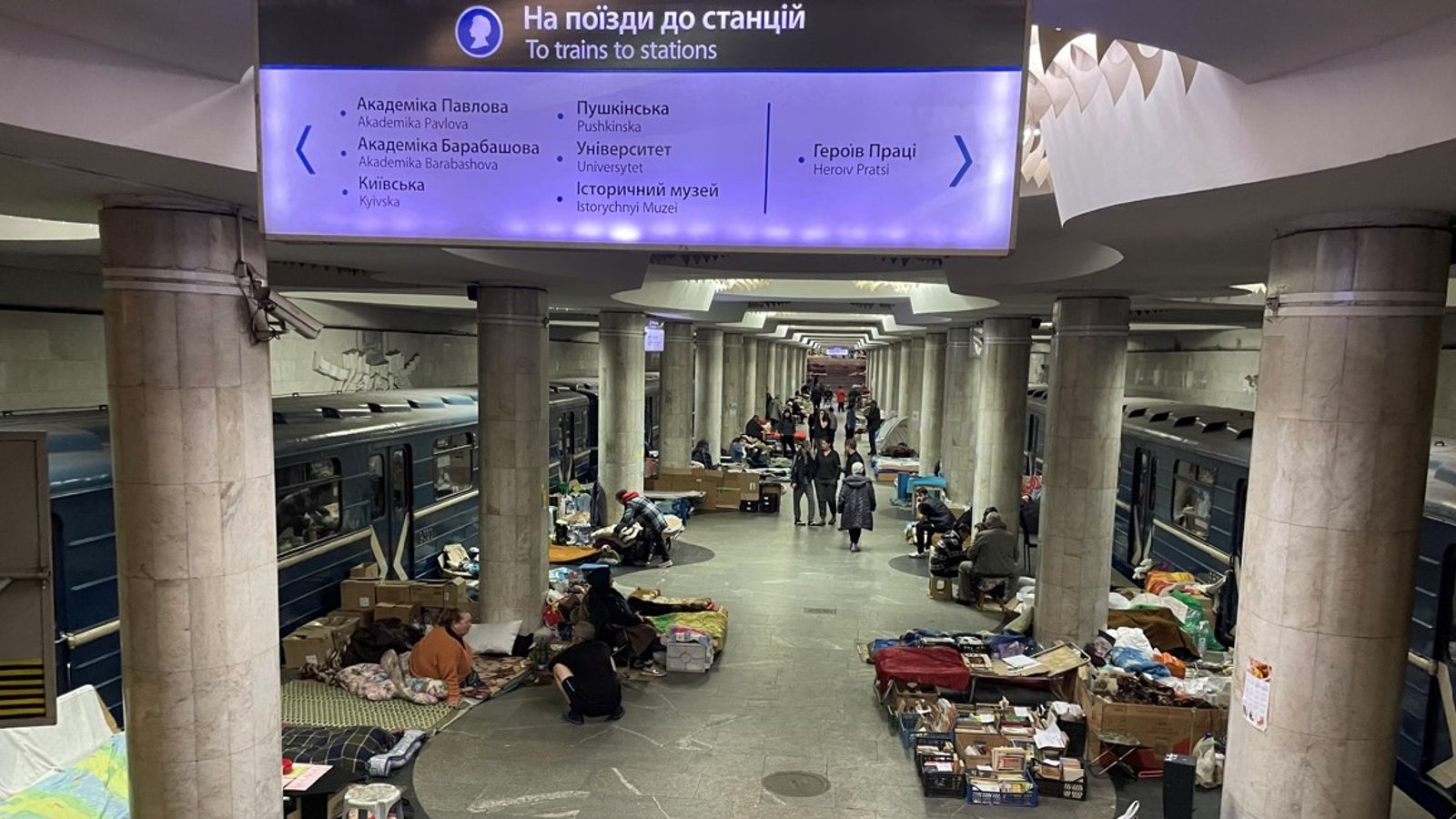 Người dân Kharkiv trú ẩn ở nhà ga tàu điện ngầm bên ngầm bên dưới lòng đất. Ảnh Sky News.