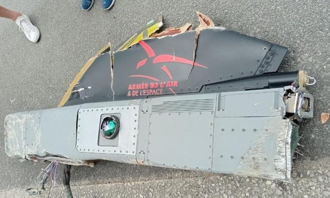 Hình ảnh hiện trường cho thấy mảnh vỡ được sơn đen và xám, có biểu tượng không quân Pháp và đèn hiệu.
