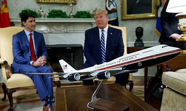 Mô hình mẫu chuyên cơ Không lực Một mới bày trên bàn trong cuộc họp giữa cựu tổng thống Mỹ Donaldm Trump và Thủ tướng Canada Justin Trudeau hôm 20/6/2019. Ảnh: AP