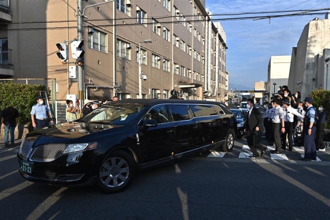 Trước 6h sáng nay, chiếc xe tang màu đen chở thi thể ông Shinzo Abe rời Bệnh viện Đại học Y Nara ở thành phố Kashihara, tỉnh Nara, nơi ông được đưa vào cấp cứu hôm qua. Bà Akie, vợ của cố thủ tướng, có mặt trên xe.