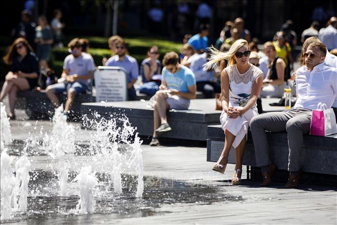 Người dân nghỉ ngơi tránh nóng tại đài phun nước quảng trường Tòa thị chính ở trung tâm London, Anh. Ảnh tư liệu: AF