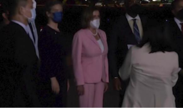 Chủ tịch Hạ viện Mỹ Nancy Pelosi (áo hồng) đặt chân tới đảo Đài Loan tối muộn ngày 2/8. Ảnh CNN