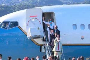 Nhà lập pháp 82 tuổi của Mỹ vẫy tay chào các đại biểu đứng chờ ở sân bay Tùng Sơn, Đài Bắc trước khi lên máy bay quân sự Mỹ. Chiếc máy bay đã cất cánh lúc 18h, theo video livestream, AFP đưa tin.